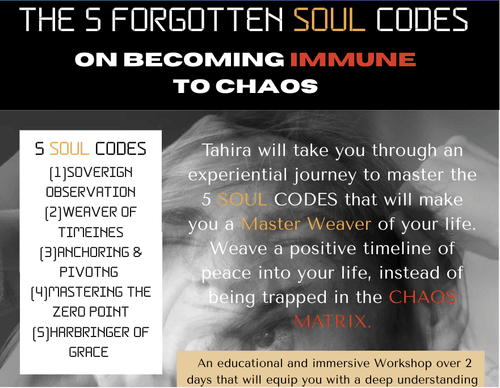 Tahira will take you through an experiential journey to master the 5 SOUL CODES that will make you a Master Weaver of your life. Weave a positive timeline of peace into your life, instead of being trapped in the CHAOS MATRIX.